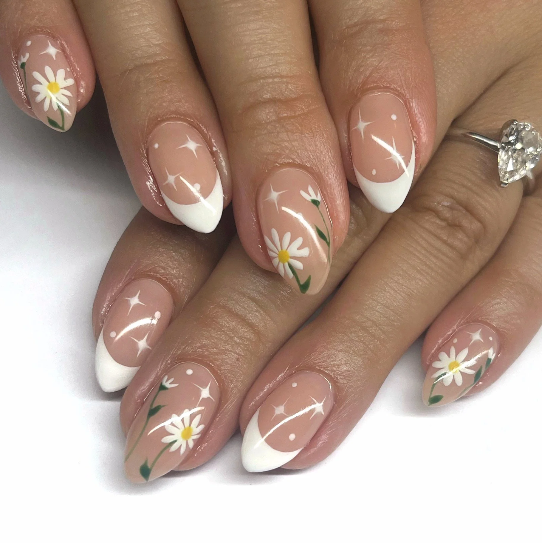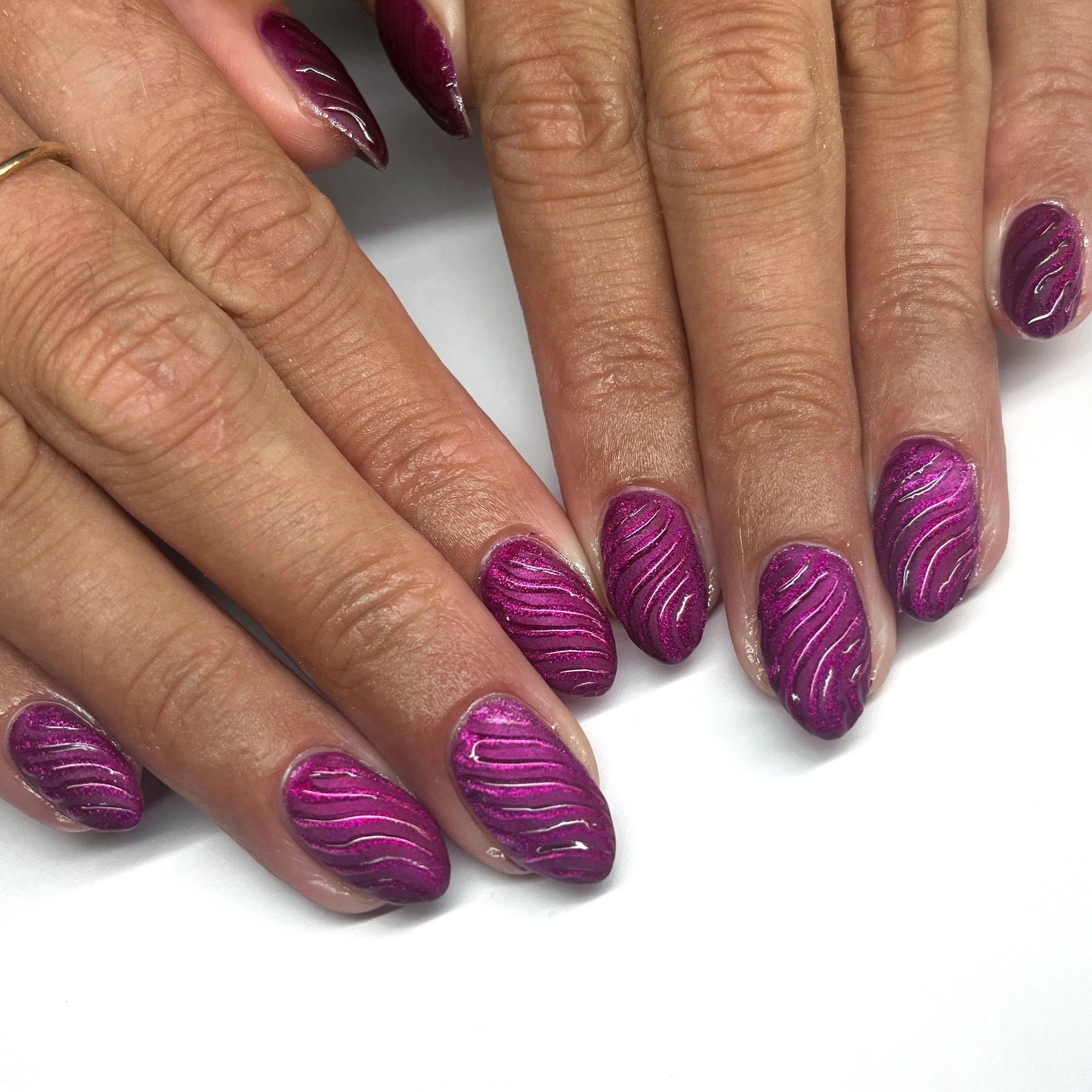 examples include (but are not limited to): isolated chrome accents; two “basic art” elements combined (i.e. french + stickers); mix-and-match sets with simple elements; 3D patterns (i.e. wavy lines); bordered/outlined nails